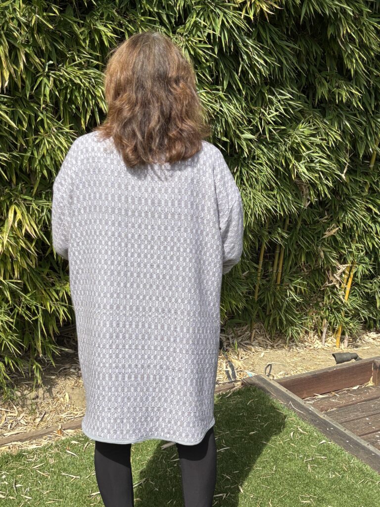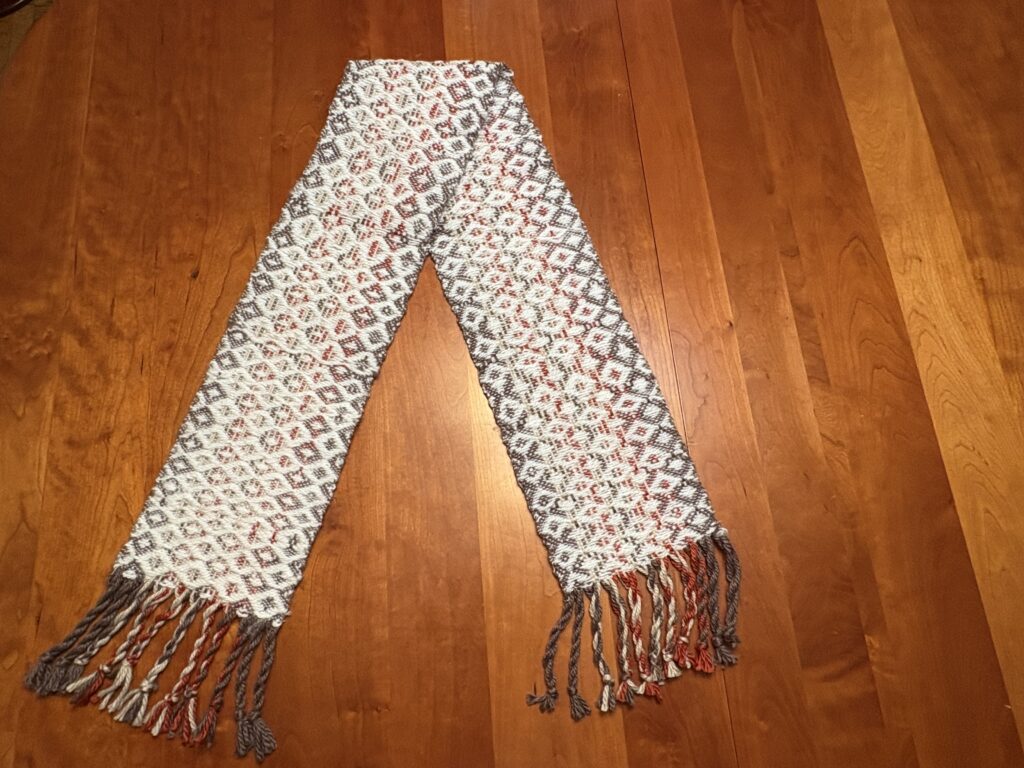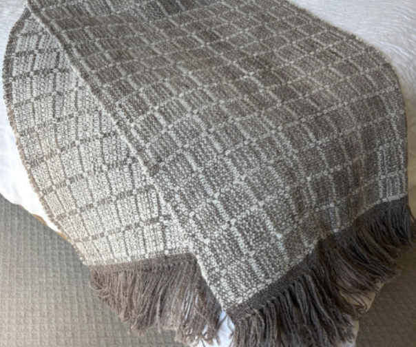 Some detail from Lizzy: “This is a follow-up to last month’s write-up on the BSHG/Serendipity Spinners sheep-to-shawl demonstration at the Santa Clara County Fair: my shawl is finished! The structure is a two-block crackle using a draft by Susan Capehart in Handwoven Fall 2025.”