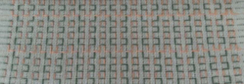 Some detail from Stefanie: “This is a runner with a white cotton warp and a bunch of recycled Sari silk cords I got on Etsy in the weft. It is quite colorful and was fun to weave. This is a 20S Lampas weave with random patterns I created on the go.